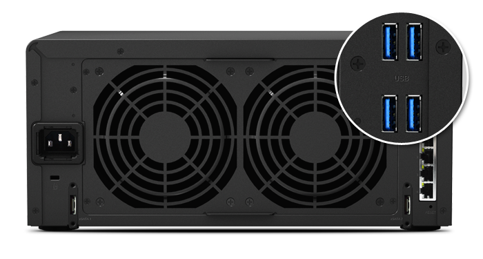DS1815+ 配備 USB 3.0 和 eSATA 埠,可與外部存儲設(shè)備連接,同時提供高速、有效的文件傳輸。USB 3.0 埠能提供高達 5Gbps 的傳輸速度 (比 USB 2.0 快 10 倍),不僅節(jié)省外接硬盤的數(shù)據(jù)傳輸時間,也可降低耗電量。