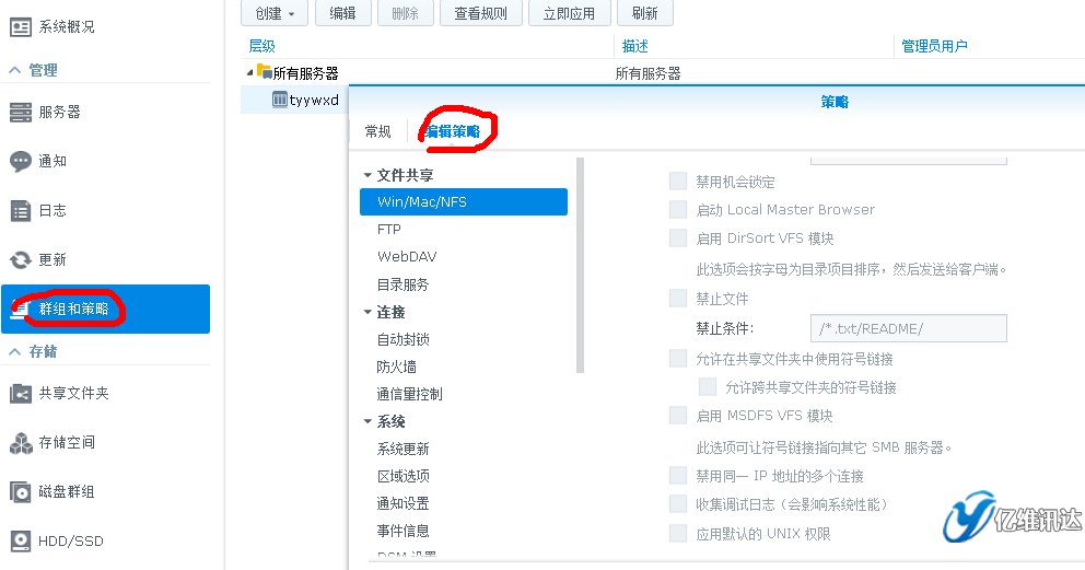 群暉Synology 山西總代:太原億維訊達(dá)科技 策略是一系列規(guī)則,其中每個(gè)規(guī)則都是指定的設(shè)置首選項(xiàng),如啟用 Windows 文件服務(wù)或啟用 SSH 服務(wù)。當(dāng)一項(xiàng)策略被應(yīng)用到托管服務(wù)器或服務(wù)器組后,被該策略規(guī)則定義的首選項(xiàng)將應(yīng)用到該服務(wù)器或服務(wù)器組。這可讓您將統(tǒng)一的設(shè)置應(yīng)用多臺(tái)服務(wù)器而無需分別登錄每臺(tái)服務(wù)器。