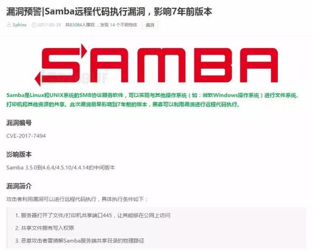 【群暉快報】2017年5月24日Samba發(fā)布了4.6.4版本,修復(fù)了一個嚴(yán)重的遠(yuǎn)程代碼執(zhí)行漏洞,漏洞編號CVE-2017-7494。安全漏洞可以讓一個有權(quán)限的用戶提權(quán)至Samba所在服務(wù)器的root權(quán)限,進(jìn)而執(zhí)行惡意程序,向該服務(wù)器發(fā)動攻擊。